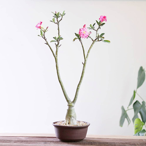 Like a bonsai plant, Desert Roses are perhaps best when in a prominent spot as a single feature plant. As a relatively short plants it’s best to have them raised on a ledge, table or something similar so you can appreciate it at its best. Desert roses don’t mind being pot bound so will usually do well in compact pots like Bonsai pots. They’re great in front of plain walls where their interesting form and flowers can have a strong contrast. Their flowers can range in colours and their forms can also be diverse. Like a bonsai some trimming can be used to steer it into a more sparce, unique and interesting form.